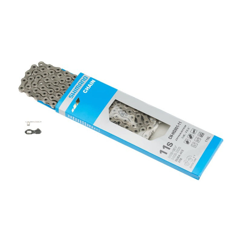 Cadena de carretera superestrecha de 11 velocidades DURA-ACE CN-HG901-11 DURA-ACE - 11 velocidades - Superestrecha - HYPERGLIDE - SIL-TEC - Cadena de carretera Las placas y rodillos de la cadena HG901-11 de SHIMANO reciben un tratamiento SIL-TEC completo para mejorar la durabilidad y la eficiencia. Su diseño asimétrico garantiza que los cambios delantero y trasero sean suaves, al mismo tiempo que reduce el ruido de la transmisión. Compatible con las transmisiones de 11 velocidades, la HG901-11 también es adecuada para utilizarlas en bicicletas eléctricas. CARACTERÍSTICAS Diseño de placa asimétrica especial HG-X11 para 11 velocidades Trasmisión trasera Accionamiento suave sin ruido Trasmisión delantera Se mantiene la seguridad de la cadena en línea de cadena cruzada Cambio delantero y trasero Cambio suave y fiable SIL-TEC en placa/rodillo Pasador hueco Peso: 247 g (114 eslabones) ESPECIFICACIONES DEL PRODUCTO N.o DE MODELO: CN-HG901-11 SERIE: DURA-ACE R9100 Serie Peso medio: 247g Tipo: HG 11 velocidades Compatible con sistema de cambio trasero E-BIKE Placa del eslabón del pasador: SIL-TEC Placa del eslabón del rodillo: SIL-TEC de Rodillo: SIL-TEC Pasador del eslabón al cromoduro Pasador hueco'.