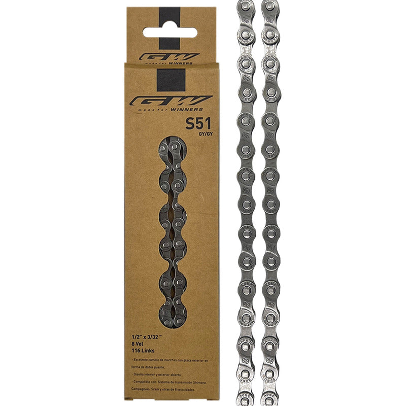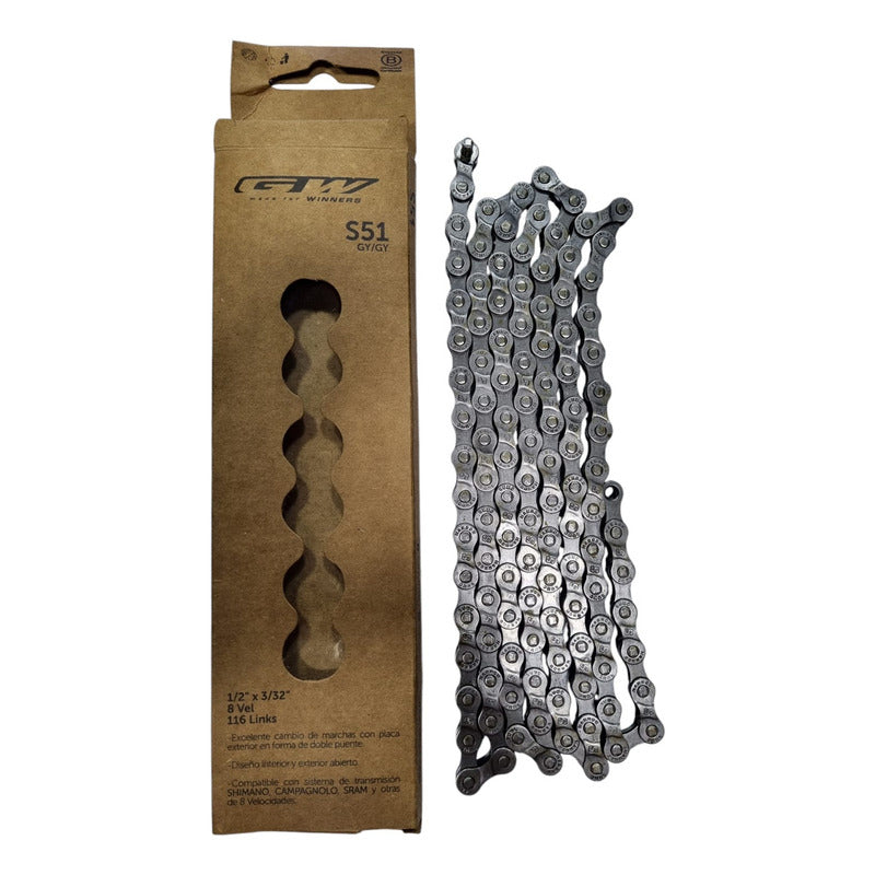 - CADENA PARA BICICLETA 8 VELOCIDADES GW S51 PARA RUTA O MTB. Las cadenas están diseñadas para los modelos Ruta/MTB/Gravel, su material acero de alta aleación generan mayor confianza y seguridad. Las cadenas GW son ideales para rodar con estabilidad y suavidad. Tecnología de alta resistencia al desgaste, de recubrimiento TICN, con diseño estructura de puente. DESCRIPCIÓN: - Marca: GW. - Modelo: S51. - Velocidades: 8. - Material: Acero. - Color: Gris - Medida: 1/2"×3/32*116l - Peso Aproximado: 315 Gramos. - Links: 116 L. - Cierre Rápido.
