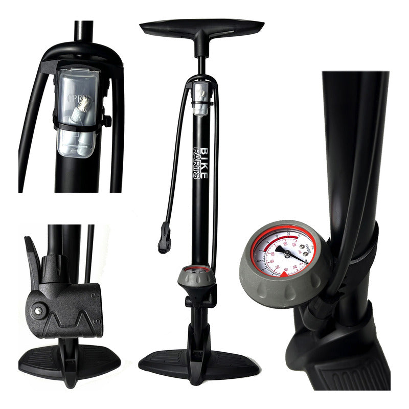 RIVOLT CYCLING INFLADOR DE PISO BIKE PARTS CON MEDIDOR , COMPATIBLE CON TODA VALVULA. Una de las mejores opciones del mercado probado tanto como para uso PROFESIONAL (talleres) y doméstico. Un inflador duradero, de gran calidad (construcción en aluminio) y alcanza una presión para inflar cualquier llanta de bicicleta o balón, incluye accesorios de inflado. - También infla MOTOS y CARROS - 160 PSI con medidor de presión - La punta es compatible con válvulas SCHRADER (de moto) y presta (delgada).