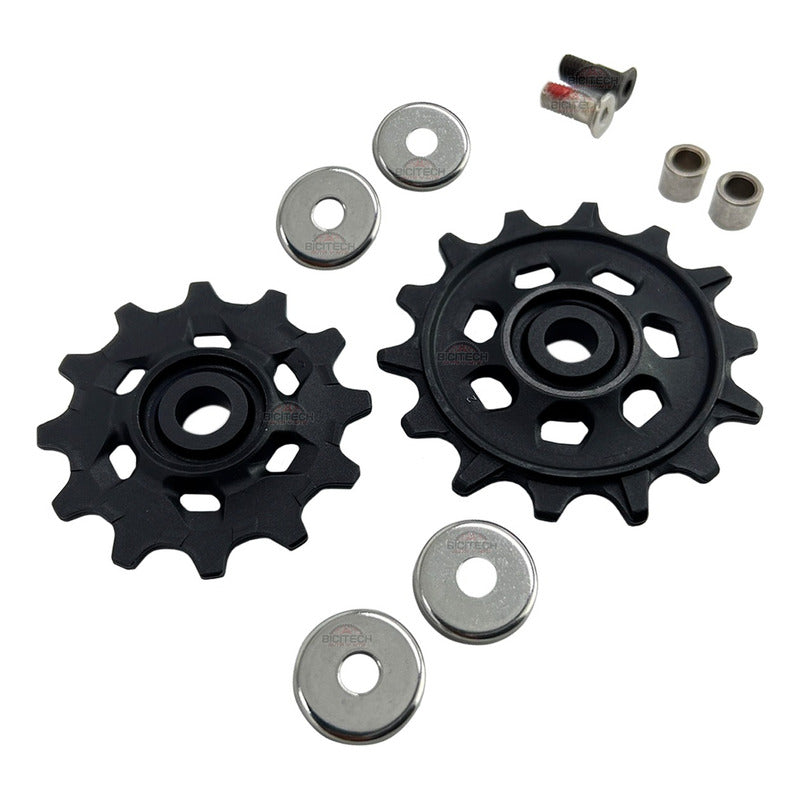 RIVOLT CYCLING DISTRIBUIDOR AUTORIZADO SRAM COLOMBIA - KIT DE RODAJAS DE 12 VELOCIDADES SRAM NX EAGLE ORIGINALES. Poleas Rodajas De Desviador Trasero De Equipo Original Para Desviadores Traseros SRAM. Las poleas deben instalarse en las posiciones correctas: la polea inferior es más grande que la polea superior DESCRIPCIÓN: - Velocidades de transmisión 12. - Compatibilidad: SRAM NX. - Rodaja Pequeña: 12 Dientes. - Rodaja Grande 14 Dientes. - Color: Negro. - Se Adapta a La Marca Sram. - El Kit incluye los tornillos. ¿Cuándo Se Envía Pedido? MercadoLibre recolecta nuestros productos a las 12 del medio día de lunes a sábado, las fechas de entrega aproximadas son la que indica la plataforma, normalmente se entregan antes. ¿Tienen alguna garantía? Todos nuestros productos cuentan con garantía por defectos de fábrica, no cubre malas instalaciones, golpes, modificaciones o desgaste por uso normal.