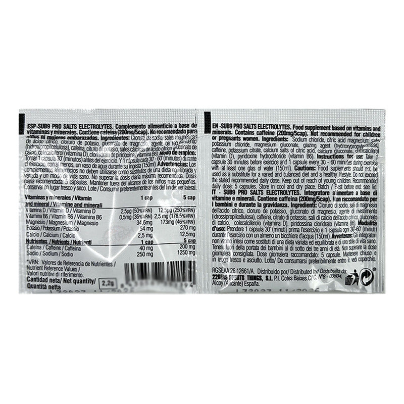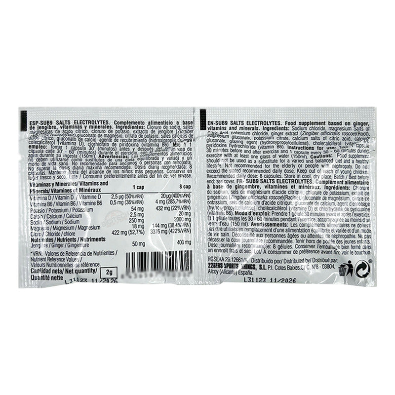 RIVOLT CYCLING DISTRIBUIDOR AUTORIZADO 226ERS COLOMBIA - DUPLO DE SALES Y ELECTROLITOS 226 ERS // SABORES: - JENGIBRE.- - CAFEINA ( SE VENDEN POR UNIDAD). Las SUB9 SALTS ELECTROLYTES son una evolución de las SALTS ELECTROLYTES pensando en una ingesta continuada durante ejercicios más extensos. Las SUB9 SALTS ELECTROLYTES son una evolución de las SALTS ELECTROLYTES pensando en una ingesta continuada durante ejercicios más extensos. En cuanto a los minerales, se ha incrementado la cantidad de sodio hasta los 250 mg y la de magnesio hasta 18,15 mg, reducido el potasio hasta 54,01 mg buscando una proporción inferior a la de las anteriores sales en cápsulas. MODO DE USO: Tomar 1 capsula 30’ (minutos) antes y después del ejercicio. Y 1 cápsula cada 30‘ - 60’ (minutos) durante el ejercicio, con al menos, un vaso de agua durante su ingesta (150ml). CANTIDAD NETA: 2,2g (2 cápsulas). FORMATO: Duplo (2 cápsulas). Monodosis, cápsulas individuales. CONSERVACIÓN DEL PRODUCTO: Mantener bien cerrado en lugar fresco y seco. ADVERTENCIAS: Los complementos alimenticios no deben utilizarse como sustitutos de una dieta variada y equilibrada y un modo de vida sano. No superar la dosis diaria expresamente recomendada: 8 unidades. Mantener fuera del alcance de los niños más pequeños. ¿Cuándo Se Envía Pedido? MercadoLibre recolecta nuestros productos a las 12 del medio día de lunes a sábado, las fechas de entrega aproximadas son la que indica la plataforma, normalmente se entregan antes. ¿Tienen alguna garantía? Todos nuestros productos cuentan con garantía por defectos de fábrica, no cubre malas instalaciones, golpes, modificaciones o desgaste por uso normal.