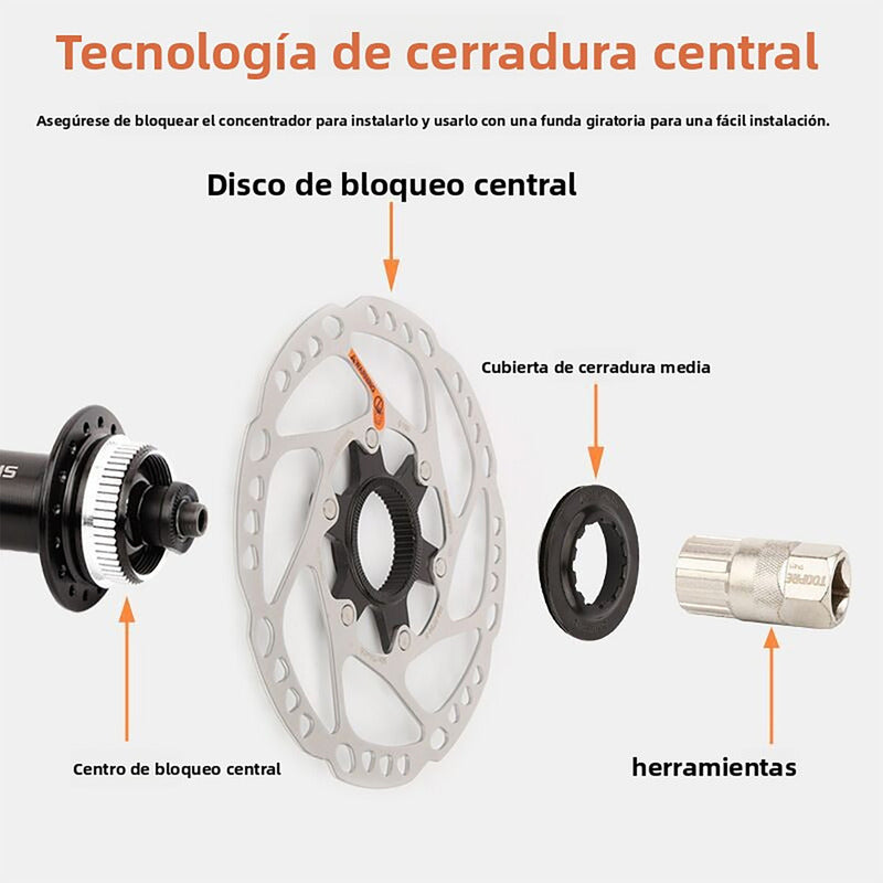 SM-RT10 SHIMANO CENTER LOCK Disco de freno 180mm TH=1.5 Los discos de freno SM-RT10 de SHIMANO proporcionan una excepcional potencia de frenado en todas las condiciones de conducción. El sistema de montaje CENTER LOCK de SHIMANO facilita el montaje y el desmontaje de los discos de freno gracias al diseño con montaje de ranura y anillo de cierre. Estilo de anillo de cierre actualizado Construcción de parte dentada interna con parte dentada externa de mayor diámetro para compatibilidad con múltiples herramientas (TL-FC36 y TL-LR11) Herramienta de instalación TL-LR11 Rendimiento de frenos eficiente y duradero Manipulación y accionamiento sencillo para ciclistas principiantes Montaje rápido CENTER LOCK'.