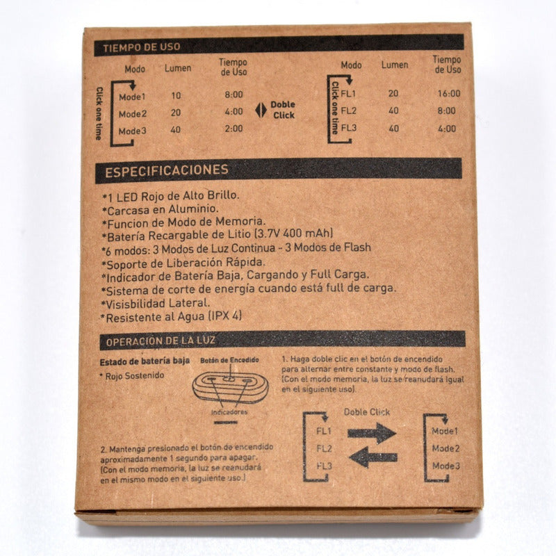 RIVOLT CYCLING - LED ROJO ALTO BRILLO -CARCASA EN ALUMINIO -FUNCION DE MODO DE MEMORIA -BATERIA RECARGABLE DE LITIO ( 3.7V 400mAh) -6 MODOS: 3 MODOS DE LUZ CONTINUA-3 MODOS FLASH - SOPORTE DE LIBERACIÓN RÁPIDA - INDICADOR DE BATERÍA BAJA, CARGADO Y FULL CARGA - SISTEMA CORTE DE ENERGÍA CUANDO ESTA FULL CARGA -VISIBILIDAD LATERAL - RESISTENTE AL AGUA. «=========================================================» ¿TIENEN ALGUNA GARANTÍA? Nuestros proveedores nos ofrecen una garantía de 30 días la cual extendemos a nuestros clientes, esta cubre daños por defectos del material o errores en la fabricación. NO cubre mala manipulación por parte del usuario.